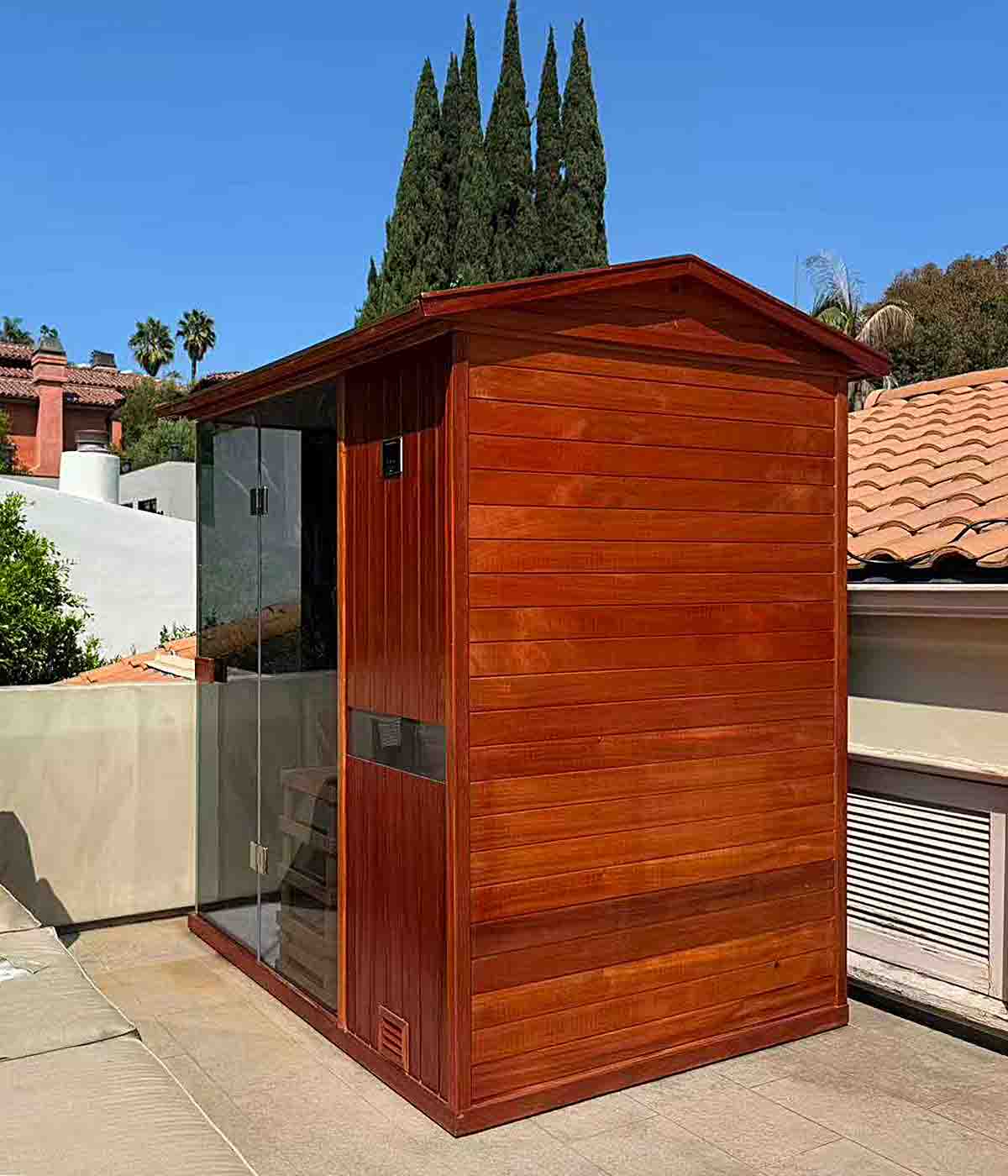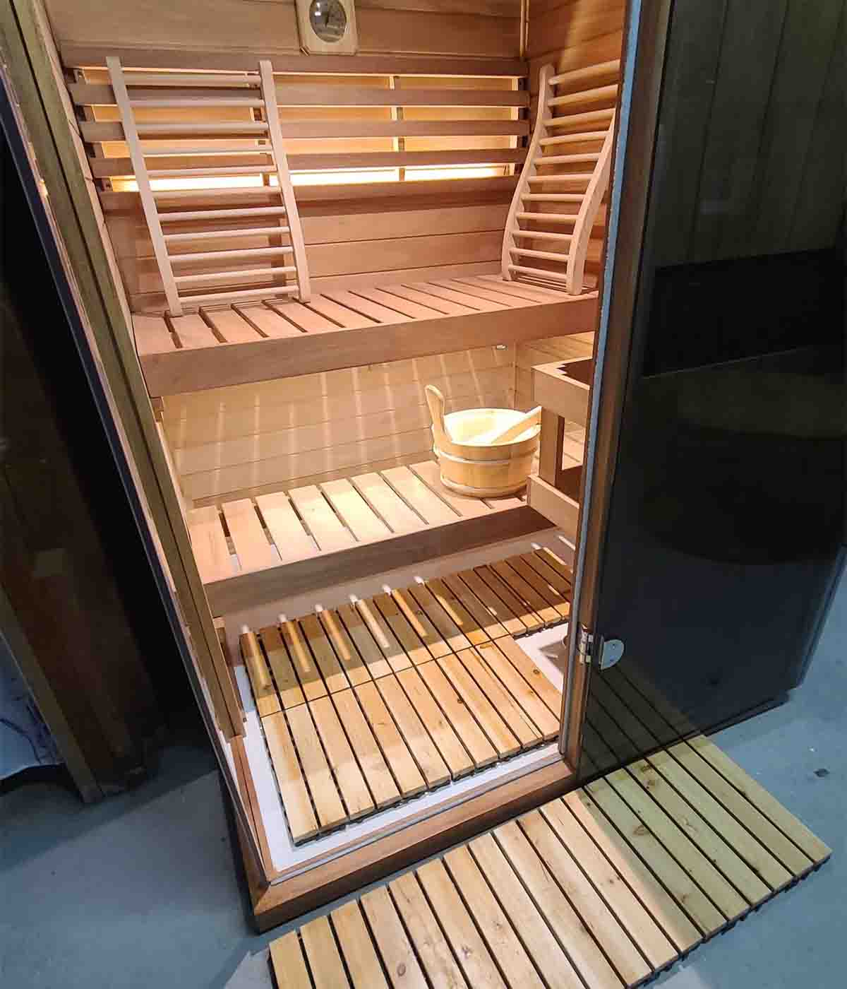Crafted from select-grade Hemlock wood and African Mahogany for superior durability, heat resistance, and a naturally aromatic sauna experience.