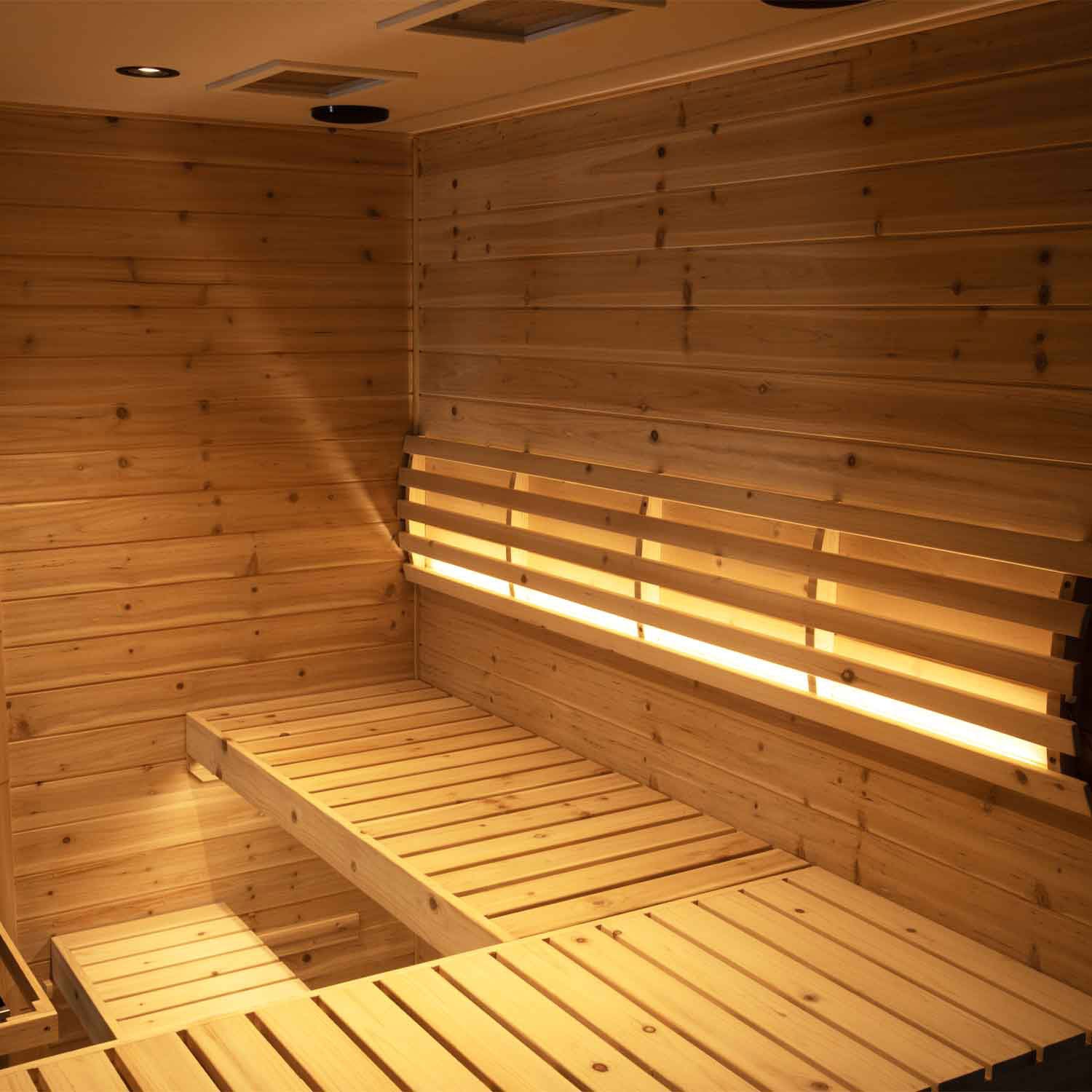 Our industry-first Negative-Ion Synergy System takes sauna therapy to the next level by combining Red light technology with a powerful concentration of negative ions (78,000-100,000 ions/cm³). This unique system purifies the air by neutralizing pollutants and disrupting bacteria, while providing gentle warmth that boosts metabolism and reduces oxidative stress. Bring you a new benefits of a deep, refreshing sauna experience.